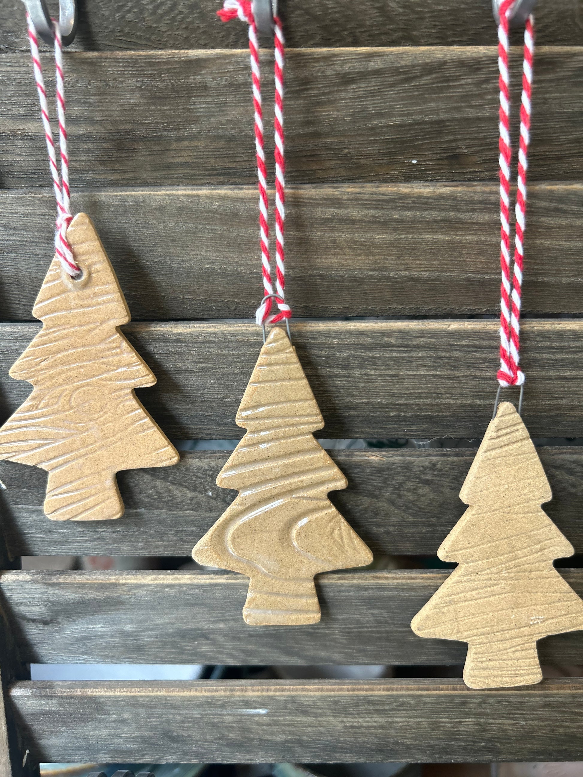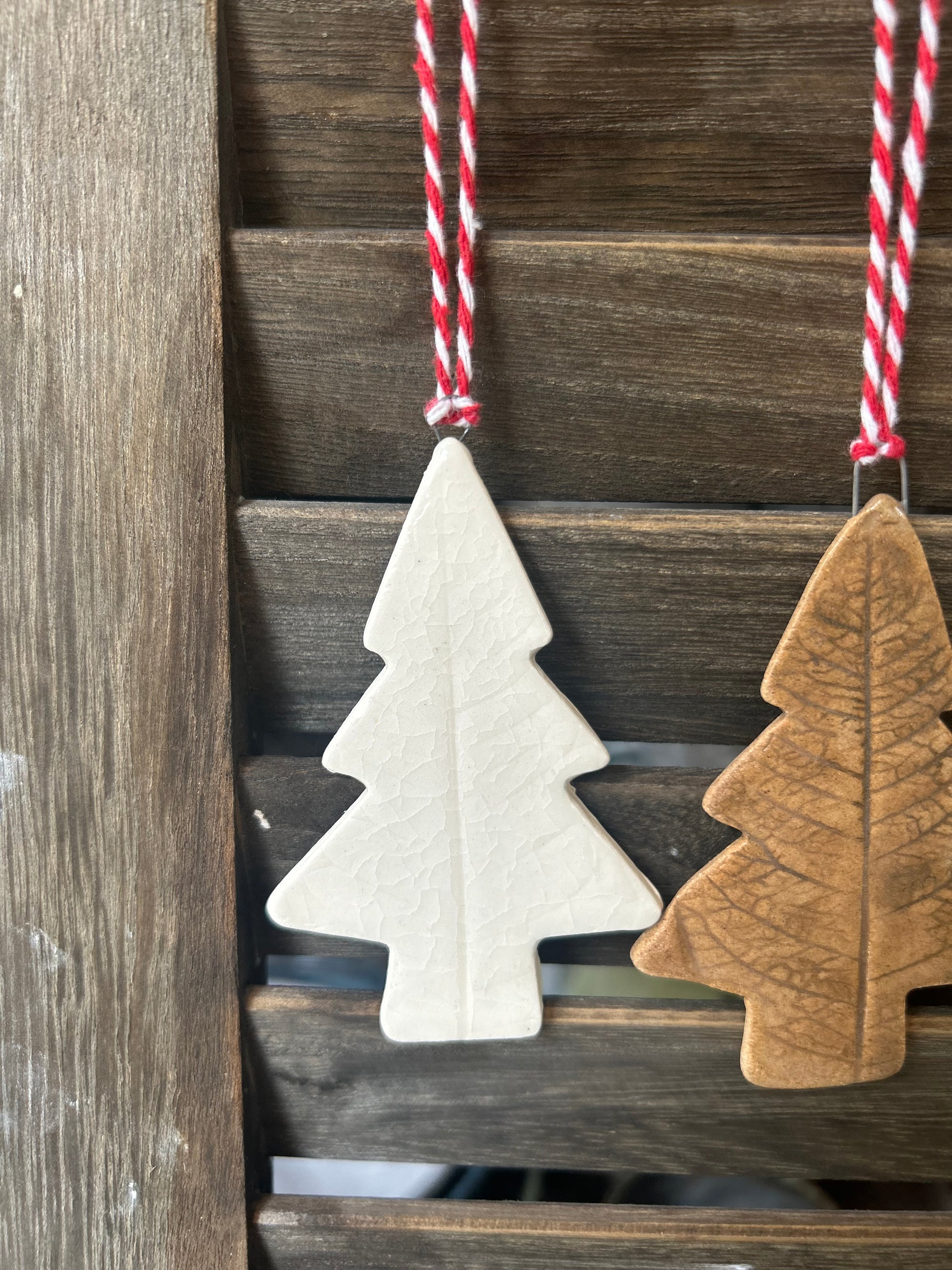 These are made of either white or brown clay, when buying ensure you have selected the base colour you're after. Come with red & white string at the top of the decoration, so they can be put on your tree or hung right away.